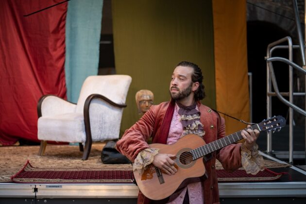 „Wer aber sind sie, sag mir, die Fahrenden, diese ein wenig Flüchtigern noch als wir“. Auf Rainer Maria Rilkes berühmte Frage zu Beginn der 5. Duineser Elegie antwortet Regisseur Yves Bombay in Trier jetzt auf höchst unterhaltsame Art. Passend zur Open Air Saison des Theaters hat er sich auf die alte Tradition der reisenden Schauspieltruppen besonnen. Als Wanderbühne und als Theater auf dem Theater inszeniert er in italienischer Sprache Gioachino Rossinis Opera buffa „Der Barbier von Sevilla“ für das Sommertheater im Brunnenhof. Sein Thespiskarren ist allerdings kein altmodisches Gefährt, sondern wie es sich für ein öffentliches Theater unserer Tage gehört, ein schnieker Anhänger im modischen Weiß mit ordnungsgemäßem Trierer Nummernschild. „Theater Trier“ steht auf den Türen zu lesen. Outdoor muss wegen des schlechten Wetters diesmal allerdings gegen indoor getauscht werden, soll heißen gegen die Bühne der Europahalle, vor der die Musiker des Philharmonischen Orchesters der Stadt Trier Platz genommen haben. Oben baut die Truppe erstmal ihre Bühne auf der Bühne auf, bevor die eigentliche Oper beginnt. Ein paar über eine Leine gehängte bunte Stoffbahnen werden zur Bühnenwand wie zur Tapete des Salons davor, den ein Sessel und ein Schreibtisch andeuten. (Bühne Yves Bombay, Alexander Roy) Als Balkon wird dahinter ein kleiner Perserteppich hochgezogen. Man ist schließlich im wohlhabenden Haus des bürgerlichen Dr. Bartolo, der sein adeliges Mündel Rosina heiraten will. Dabei kommt ihm der heillos verliebte Graf Almaviva mit allen möglichen Tricks in die Quere.