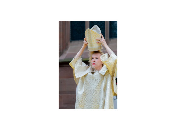 Papst Leo X, spektakulär irre verkörpert von Sunnyi Melles in „Luther“ vor der Wormser Domkulisse.als Papst Leo X © David Baltzer, Nibelungenfestspiele Worms
